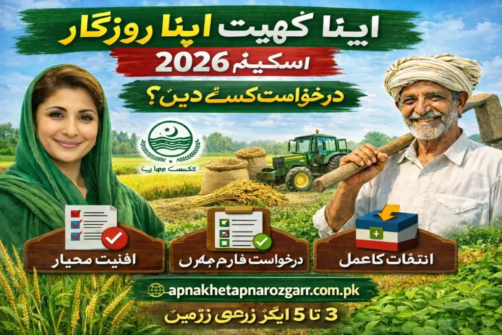 اپنا کھیت اپنا روزگار اسکیم 2026 پنجاب حکومت کی ایک فلاحی اسکیم ہے جس کا مقصد بے زمین اور غریب کسانوں کو زرعی زمین فراہم کرنا ہے تاکہ وہ کاشتکاری کے ذریعے اپنا روزگار کما سکیں۔ اس اسکیم کے تحت اہل افراد کو سرکاری زرعی زمین دی جائے گی، جس سے دیہی غربت میں کمی، زرعی پیداوار میں اضافہ اور خود روزگاری کو فروغ ملے گا۔ یہ اسکیم خاص طور پر پنجاب کے دیہی نوجوانوں اور کم آمدنی والے خاندانوں کے لیے ایک سنہری موقع ہے۔